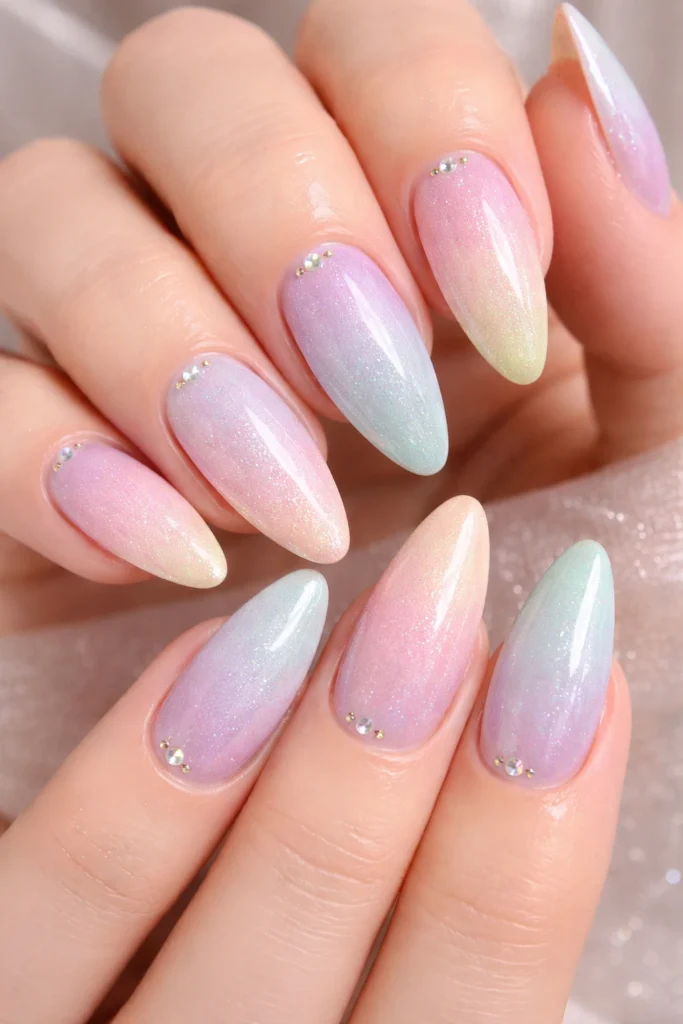 Here, pastel shades are paired with tiny crystal accents placed carefully on one or two nails. The crystals add sparkle, but because they are minimal, the look stays elegant.